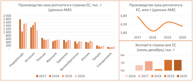 По данным агентства AMI, в 2020 г. общее производство лука репчатого в ЕС по сравнению с предыдущим годом снизилось на 4% до 6,2 млн тонн, но произошло это исключительно из-за резкого падения производства в Испании. Эта страна – крупнейший производитель лука репчатого в ЕС и второй после Нидерландов крупнейший экспортер этой продукции среди стран Евросоюза.